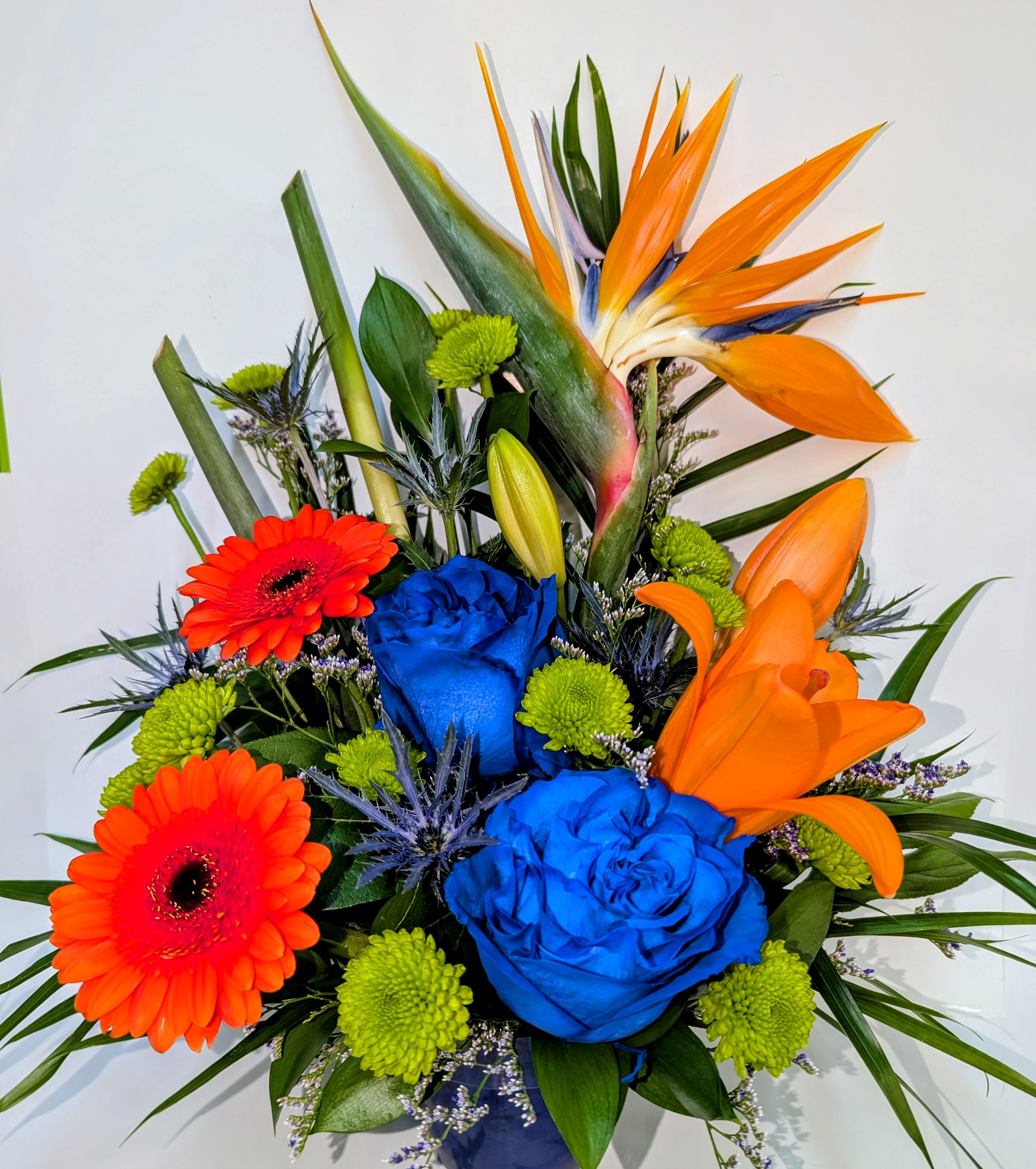 Bird of Paradise, blue roses, and other bright blossoms make a bold statement! A lively posie guaranteed to get people talking… a fun blend of Nature’s creativity and human ingenuity.  It’s a copper ‘n’ blue combo perfect for Oilers fans, too!