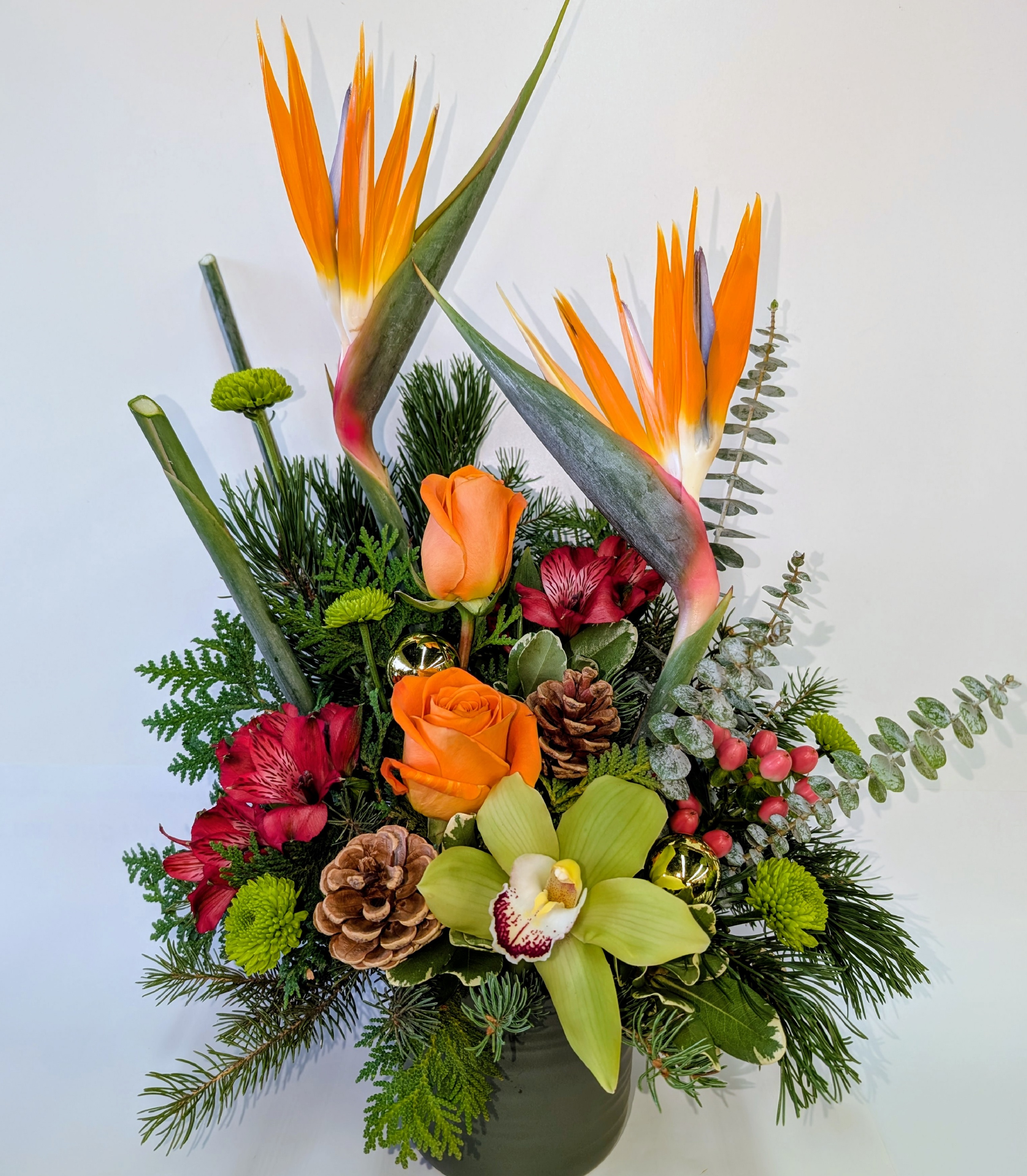 Splashes of sparkle give this modern, Tropical-inspired floral creation a fun holiday flair!  Birds of Paradise, Cymbidium Orchid, and Roses send Christmas cheer with a touch of the exotic.