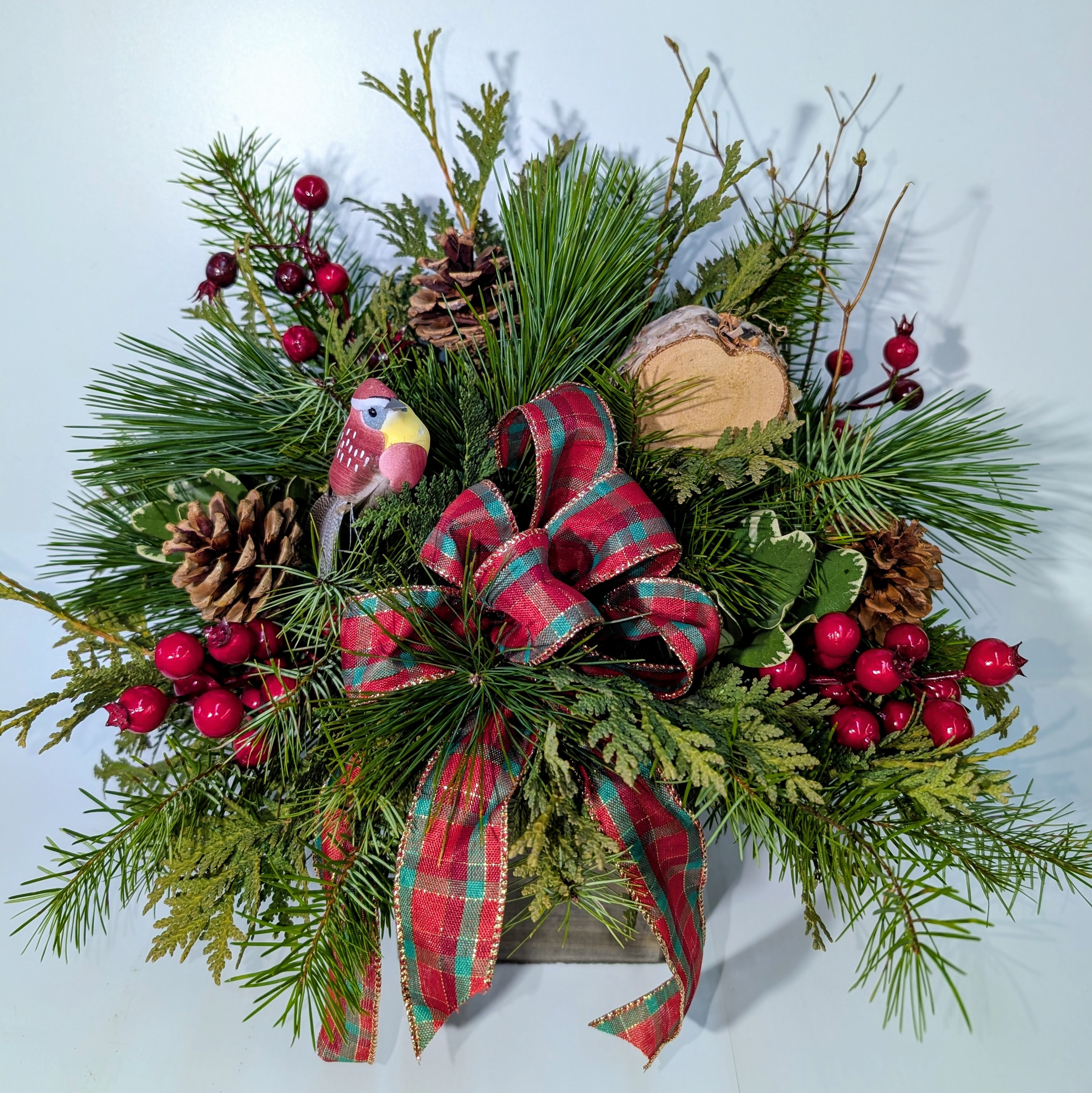 Celebrate nature! A bushy centerpiece of lush evergreen boughs, pinecones, berries, a big fluffy bow , and a cute winter bird combine to bring home the beauty of the great outdoors and a touch of whimsy. A perfect way to bring home the fragrance of the forest to a small space. Jazz things up with the “deluxe” version, shiny balls, and the textures of eucalyptus, and more! Container style may vary.