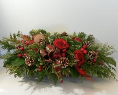 A long and lush centerpiece is sure to send the cheerful spirit of the holidays.  Featuring loads of textured, natural foliages, velvety Red Roses, and delighful Christmas accents, this arrangement will give lasting joy throughout the season.