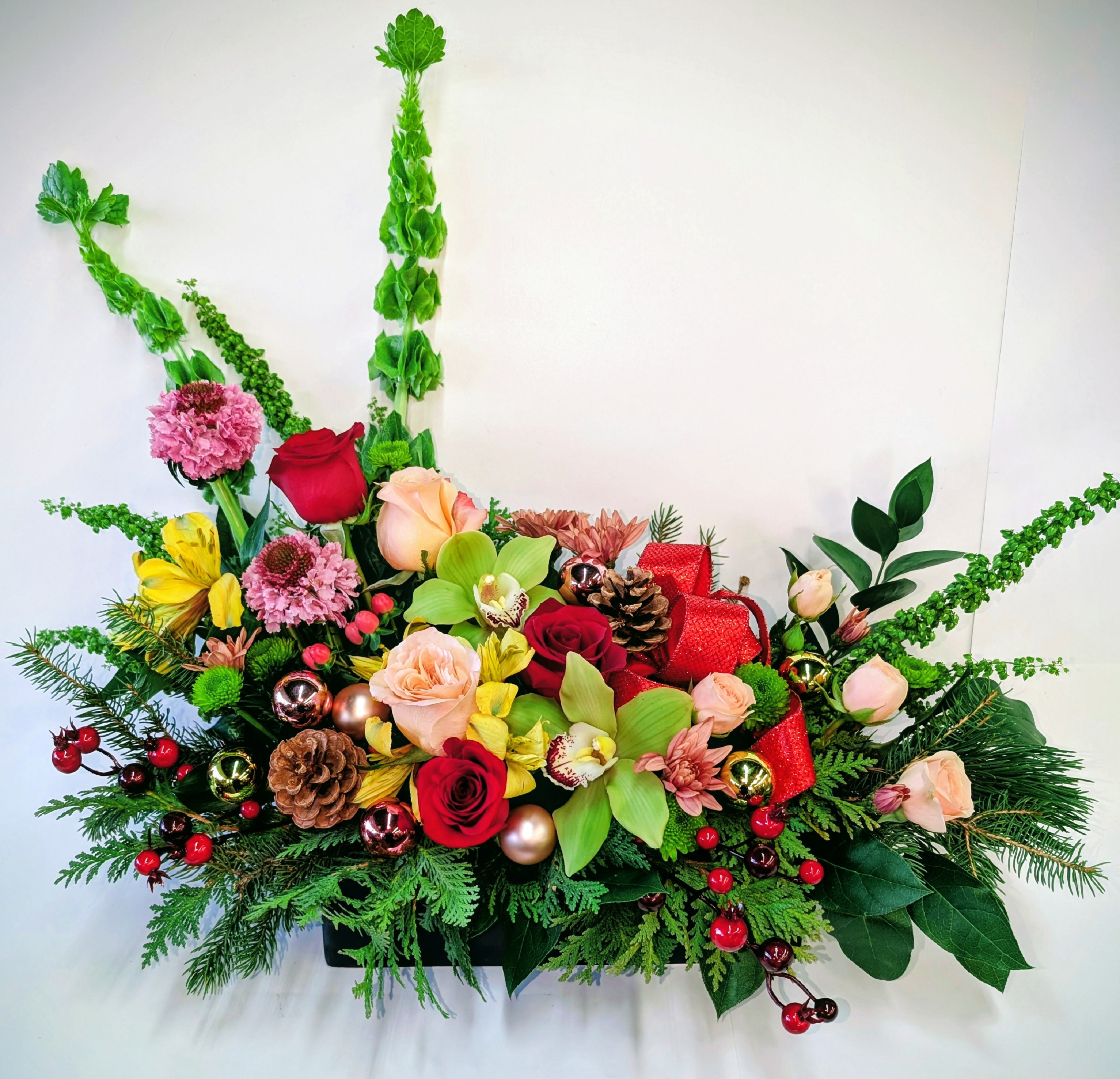 A lush tapestry, featuring Orchids, Roses, and much more, created in the full style of the European Renaissance era. Sparkling accents add a touch of holiday flair to compliment any Cristmas decor.